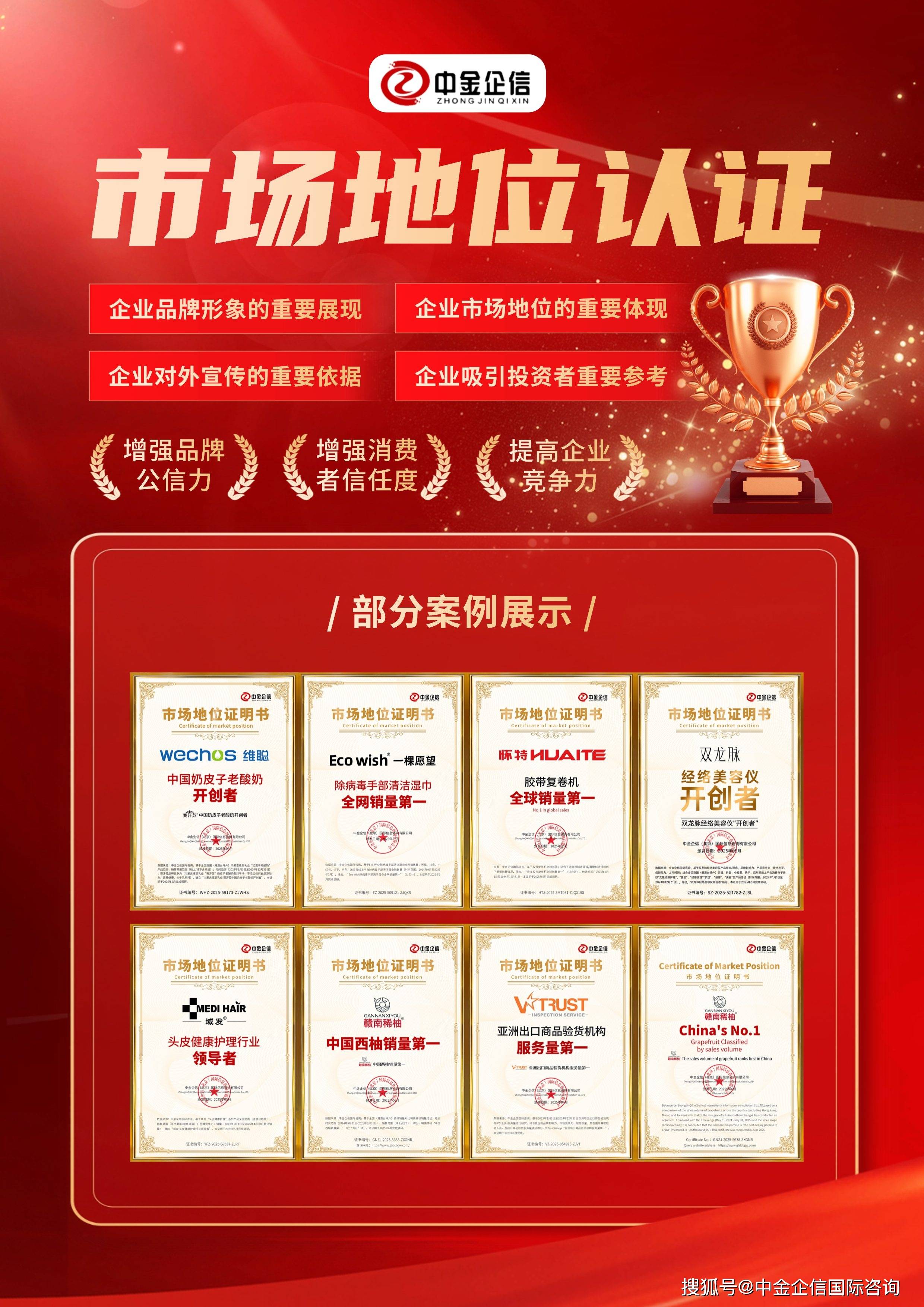 ,为您供给品牌/市场地位&市场拥有率证明;权势巨子、可托、高效的证明背书,让您的品牌更无力。市场地位认证/证明合用于(包罗但不限于)数字前言如社交、梯媒、公司官网、搜刮引擎、正在线视频等数字平台广布;电视告白、电梯告白、印刷如、、宣传册、海报等;户外前言如机场、地铁坐、建建物外墙等户外场合展现;电商曲播间、各类包拆物料、线下勾当等全径场景。市场地位认证&证明词条(包罗但不限于):初创者、销量第一、第一品牌、领先、一线品牌、引领者、市场拥有率第一、品牌认证、对劲度认证、用户数量认证、品牌口碑认证、领军/带领品牌等。中金企信国际征询为各范畴企业/品牌供给市场地位认证/证明供给权势巨子、专业、、