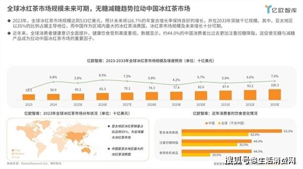 冰茶赛道的火热并非偶尔,而是千亿级市场规模的支持取消费者需求的深刻改变。据亿欧智库《2025中国瓶拆冰红茶饮料行业》数据显示,2023年,全球冰红茶市场规模已达到533亿美元,估计将来将以6。7%的年复合增加率持续增加,并正在2033年冲破千亿规模。这一数据不只展示了冰茶赛道庞大的成长空间,更预示着行业将送来新一轮的增加盈利,吸引着越来越多品牌入局分食“蛋糕”。