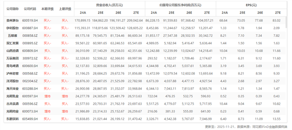 食物饮料风险充实,底部明白,短期看赔率,中期找业绩。1)短期继续买卖“个股改善”、“窘境反转”从线,买入),相关标的安井食物(603345,未评级)等;2)布局性盈利延续,保举东鹏饮料(605499,买入)、盐津铺子(002847,买入);3)需求侧企稳或份额从线,买入)、伊利股份(600887,当前食饮板块履历持久回调,内需关心度较低,估值已显著回落,市场预期处于低位,白酒等优良资产底部逻辑清晰。正在外部扰动从头,带动内需主要性提拔的布景下,食饮板块无望送来估值切换取修复行情。沉点看好以下板块,1)白酒。四中全会胜利闭幕继续看多经济,爱惜当前低位结构机遇。2)零食&饮料。细分赛道维持高景气宇,东鹏饮料持续高增。3)乳成品:关心原奶价钱变更,行业拐点临近。11月18日,全国常委会法工委行室担任人就新通过的《食物平安法》批改草案回覆了记者提问,该点窜决定将自2025年12月1日起正式施行。此次修法采用“小暗语”模式,次要聚焦两个凸起问题:一是加强沉点液态食物(如食用油、酒类等)的道散拆运输监管,明白对此类运输行为实行许可办理,并要求发货方、收货方和承运方配合承担检验、核验权利。二是将“婴长儿配方液态乳”正式纳入取婴长儿配方乳粉不异的严酷注册办理系统。这些点窜旨正在补齐特定范畴的监管短板,通过强化准入办理、加强过程监管和完美法令义务,为相关范畴的食物平安工做夯实根本,确保人平易近群众“舌尖上的平安”。下一步,国务院相关部分将放松制定配套的具体办理和产物目次,以保障法令无效实施。据报道,11月14日,美国颁布发表对跨越200种进口食物实施关税宽免,此次关税宽免清单涵盖了咖啡、牛肉、喷鼻蕉、可可、橙子以及多种热带生果和喷鼻料等日常食物。美国食物财产协会(FMI)对此暗示,这一行动不只有帮于缓解消费者的糊口成本压力,也利好那些正在出产和供应链中利用这些进口产物的美国制制商。这一政策调整的布景是美国国内食物价钱持续面对上涨压力。例如,按照消费者价钱指数数据,正在2024年9月至2025年9月期间,咖啡和牛肉的价钱同比别离上涨了约19%和15%。因而,这一关税宽免政策被遍及视为应对国内食物通缩压力的行动。。据全国饮料尺度化手艺委员会网坐,11月18日,国度相关部分发布了《关于D-阿洛酮糖等20种“三新食物”的通知布告》以及对其的解读。“三新食物”指的是新食物原料、食物添加剂新品种和新型食物相关产物。此类通知布告的发布,意味着这些新的原料或添加剂通过了平安性审查,能够被地用于国内的食物出产取加工中。这为食物饮料行业的立异取成长供给了新的原料选择,并为企业研发新产物供给了明白的律例根据。据商报,近年来,光瓶酒市场持续扩容,2024年规模超1500亿元,年复合增加率达17%,50元价钱带成合作核心,牛栏山、汾酒等保守品牌取茅台、洋河等新入局者稠密推新。然而,行业面对利润空间低、大商模式壁垒等挑和,部门10元以下产物毛利率不脚40%。业内指出,光瓶酒已从“低价走量”转向“高质量合作”,需通过产物焕新、渠道优化及数字化营销升级实现突围。将来,高线元价钱带成巨头必争之地,行业生态将沉构。据懂酒谛,当前,白酒行业消费断层取渠道压力双沉窘境。宴席场景中,超对折白酒未被饮用,折射出年轻群体(Z世代白酒消费占比仅8。7%)及老年摄生群体对白酒的。经销商面对价钱倒挂、现金流严重问题,超50%经销商反馈倒挂加剧,21家上市酒企中仅6家实现营收利润双增加。为突围,酒企加码低度酒、高线光瓶酒,并聚焦宴席市场2022年宴席消费占比40%,规模超2300亿元,但合作已转向“品牌力+性价比”红海,可否成为“拯救稻草”仍待察看。据人平易近网-贵州频道,四时度,贵州仁怀酒企通过酱喷鼻白酒认证赋码建牢质量信赖,订单量稳中有升。衡昌烧坊包卸车间双线出产,每瓶酒贴绿色认证码,扫码可溯源原料、出产、储存全流程,线%。配套包材企业同步发力,申仁包拆印务全从动化设备笼盖率95%,标贴日产能从30万张提拔至70万张,月度订单800万至1000万套。酒企取包材企业协同,建立“质量认证+财产配套”模式,财产链上下逛同频共振,为年度方针冲刺注入强劲动力。据时代财经,11月20日,记者从抖音方面获悉,近期抖音正在日常管理中发觉,部门黑产账号通过发布茅台酒特写、正在曲播中展现“高仿茅子货源”等多种体例,吸引方针受众去坐外进行违规买卖。抖音暗示,请勿轻信此类打着“高仿”表面导流买卖的黑产团伙,不只容易掉入诈骗圈套,还可能成为黑产链的一环。据其披露,本年以来,抖音曾经封禁此类违规导流买卖账号60万个。此外,近期抖音电商倡议了专项步履,沉点管理以“虚假低价茅台”为噱头的违规引流,以及有“高风险假货”嫌疑的非常低价行为。据中国国际啤酒网,11月17日,据知恋人士透露,嘉士伯正正在考虑出售其部门亚洲营业,札幌控股无限公司成为次要买家。知恋人士透露,嘉士伯正正在取这家日本公司进行洽商,后者倾向于收购嘉士伯亚洲营业的少数股权。该名知恋人士还暗示,若是两边无法就股权比例和其他条目告竣分歧,此次买卖可能无法完成。札幌控股公司的一位讲话人置评,称该公司并非此动静来历。嘉士伯的一位讲话人暗示,不合错误市场传说风闻或猜测颁发评论。札幌控股公司也正在推进出售其子公司札幌不动产公司