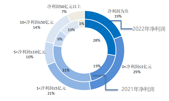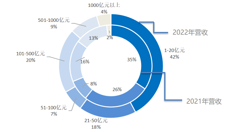 2022年的企业营收数据取2021年类似,50亿元营收以内的企业占比约六成;100亿元以上的企业仅占比三成多,此中100-500亿元的企业占比相较2021年有所添加,达20%,500亿元以上的企业仍较少,仅有13%。