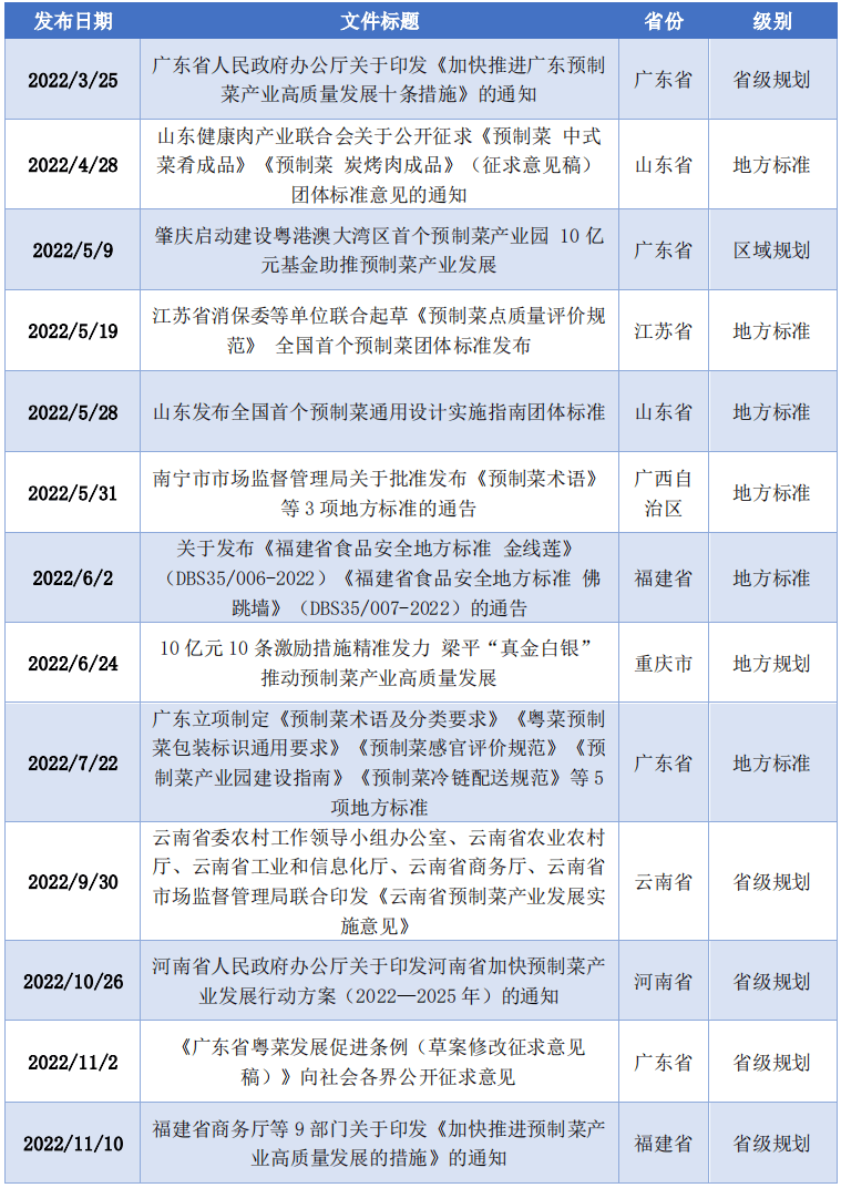 预制菜财产链条长,正在推进农产物深加工、食物制制转型、消费升级、创业就业等方面均具有积极意义,近年来各地部分连续出台政策进行指导、激励和规范。