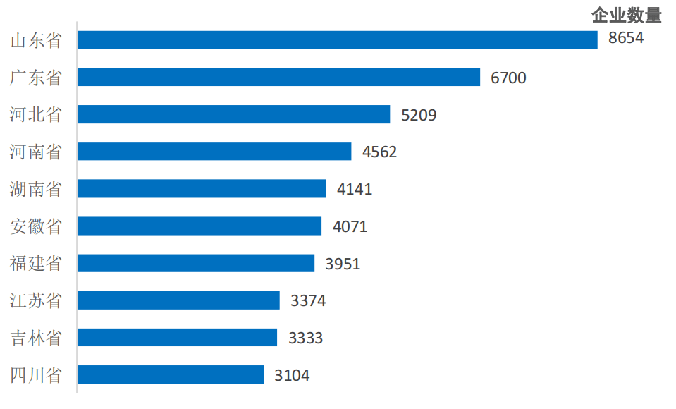 图2-4 预制菜企业数量Top10省份(截至2022年12月31日)(图表数据来自毕马威《2022年中国餐饮企业成长演讲》)。